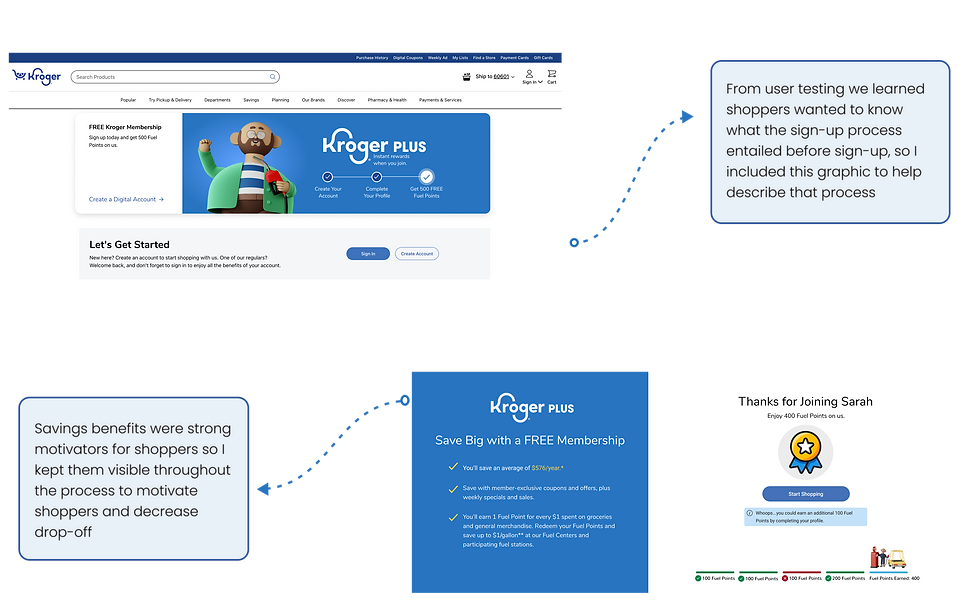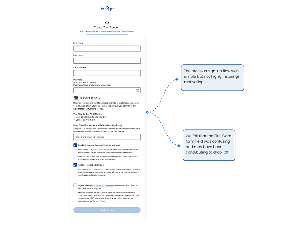 The current page was using many different terms to refer to our savings programs (Loyalty Program, Rewards Program, Free Membership, Boost Membership, Kroger Plus). Moving foreward we wanted to align on a consitent naming convention that resonated best with users expectations.